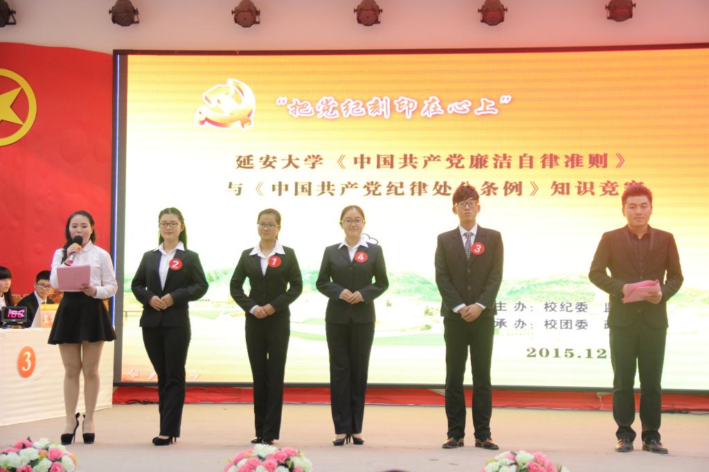 2015年12月15日晚七点,由校纪委主办的《准则》和《条例》知识竞赛在大学生活动中心举行。参加本次竞赛决赛的4个队伍医学院、经管学院、文学院、化工学院都是由先前笔试而选拔出的优秀队伍。我院由党委书记舒永安老师带队组织,由申圆圆老师,王田田、刘咪、王洋三位同学代表化工学院参赛。出席本次竞赛活动的有延安大学校长张金锁、纪委书记王顺、总会计师范育琳以及各个学院的领导和部分学生。