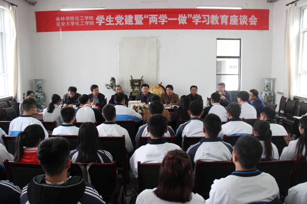 2016年10月30日,榆林学院化工学院党委书记付凯卿、院长马亚军等带领30余名学生党员、学生会干部与我院学生进行党建暨“两学一做”学习教育座谈会。延安大学党委组织部副部长郭伟、我院党委书记舒永安、院长张琰图、党委副书记刘雨录、学院辅导员以及20余名学生党员干部参加了此次学习教育座谈会,我院学生党支部副书记徐菁主持会议。