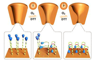 论文以“Biomimic Peptide-Gated Nanoporous Membrane for On-Demand Molecule Transport”(按需分子运输的多肽门控纳米孔膜)为题,介绍了一个基于多肽修饰的纳米多孔膜可控分子运输门控系统。可控离子、分子运输是生物功能的基础,同时也是按需给药、能量转换及海水淡化等应用的前提。本工作将尺寸、形状可控的人工智能纳米通道多孔膜和多肽分子相结合,借助于电解质溶液中的微氧环境,诱导多肽分子在孔道内缓慢进行构型转变,进而实现自驱动的门控效应,最终可以很好地控制分子运输速度和剂量。同时,在外加刺激的作用下,孔道内的多肽进行可逆的构型转变,因此该体系能够实现长效、可重复、可调节的按需分子运输功能,并有望通过局部药物递送用于相关疾病治疗。该成果的发表使我校功能界面材料领域的研究又上一个新台阶。