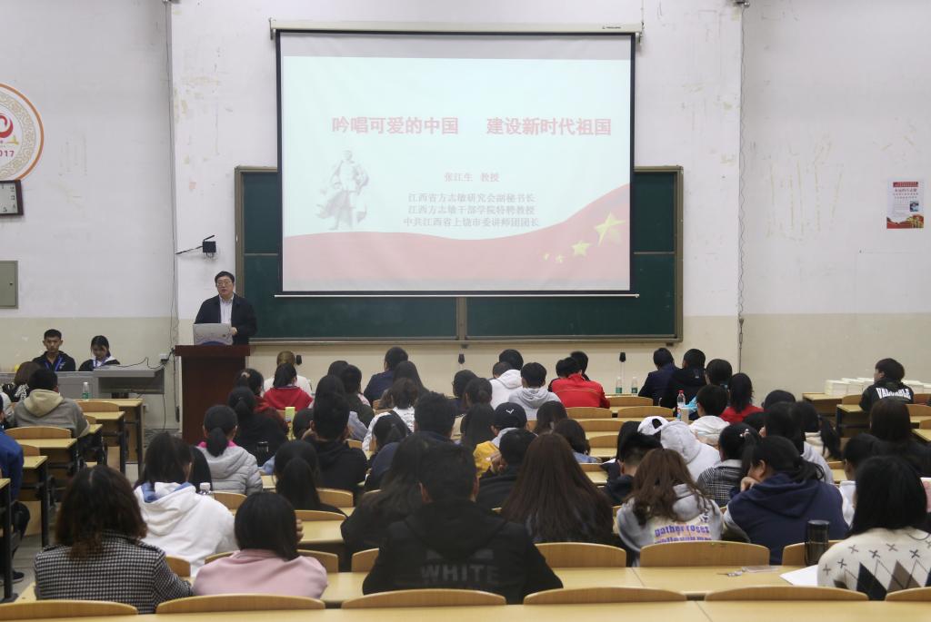 本次活动邀请了江西省方志敏研究会副秘书长张江生教授为广大师生作题为《吟唱可爱的中国 建设新时代祖国》的报告。张江生教授用详实的文字与图片资料,富有感染力的语言,阐释了以爱国、创造、清贫、奉献为主要内涵的方志敏精神,勉励青年一代要弘扬传承方志敏精神,做爱祖国、爱家乡,有理想、有抱负,善思考、善创新,讲节俭、讲清贫,能奉献、能担当的新时代大学生。