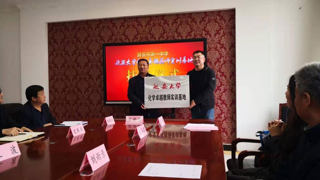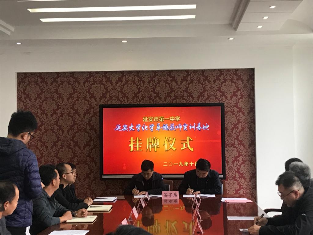在揭牌仪式上薛文辉首先介绍了延安市第一中学的历史沿革及学校的发展现状和教育教学情况,对在校实习的我校学生表现予以肯定;党子奇代表延安大学谈了我校师范生人才培养工作的基本做法以及进一步深化实践能力培养的设想,宣布了《关于在延安市第一中学建立化学卓越教师实训基地的决定》;舒永安与薛文辉分别代表双方单位签署了协议书;随后党子奇与鲁玮共同为“化学卓越教师实训基地”揭牌;最后,鲁玮做了进行总结发言,表达了与我校全力合作着力打造新时代优秀师资的愿望。
