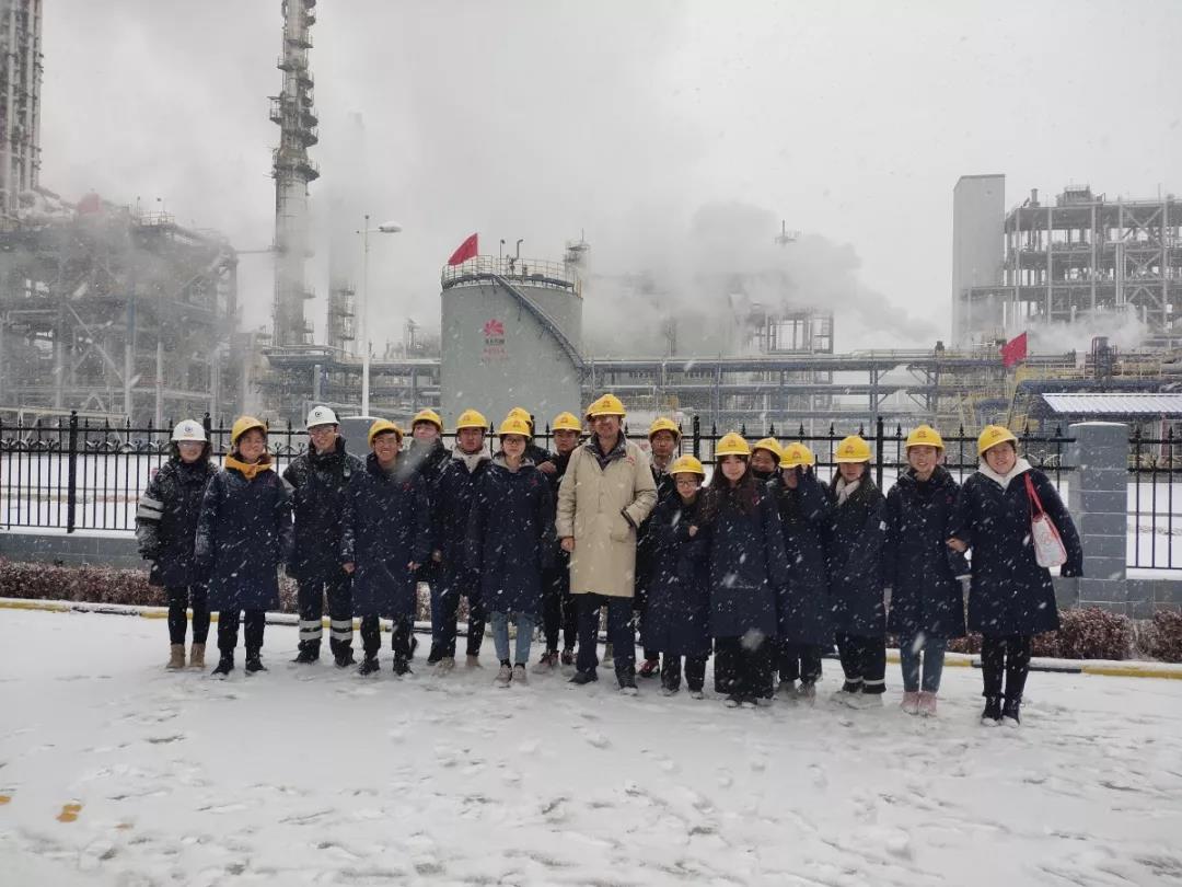 此时窗外雪花依然漫天卷地落下来,纷纷扬扬,为工厂增添了别样美景。大雪和寒冷丝毫没能阻挡大家热情的脚步,大家穿戴好安全防护用品,带着满腔热情,余兴未尽,冒雪前行,大雪中,曹老师和工厂技术人员为同学们细心讲解工厂装置的工作原理。寒冷并没有将同学们热切的学习热情降温,都捧着好奇不断地向工厂技术人员和老师请教,一行人在漫天飞舞的雪花中留下了一串串坚实的脚步和美丽的身影。