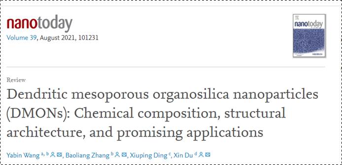 近日,我校化学与化工学院王亚斌副教授(第一作者、通讯作者)、西北工业大学张宝亮教授(通讯作者)、中国科学院青海盐湖研究所丁秀萍高级工程师、北京科技大学杜鑫教授(通讯作者)联合在《Nano Today》杂志发表题为“Dendritic mesoporous organosilica nanoparticles (DMONs): Chemical composition, structural architecture, and promising applications”的综述论文。延安大学为第一署名单位,论文链接https://www.sciencedirect.com/science/article/pii/S1748013221001560。
