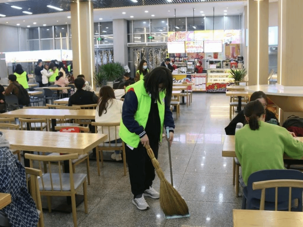 首先,志愿者在杨家岭校区第二餐厅门口集合,穿上志愿者服装前往工作岗位,随后在食堂阿姨的耐心讲解下了解食堂阿姨工作内容和技巧,根据工作需要,志愿者分为两组,一组帮助阿姨打扫食餐厅,另一组则则负责打扫餐桌,将餐桌上的饭粒、残渣、纸巾等垃圾回收到收餐台处,统一进行处理,也为下一位来用餐的学生提供良好的就餐环境。工作期间,志愿者按要求佩戴口罩,不仅保障了食堂饭菜的卫生,让同学们吃得放心,同时也落实了疫情防控的指令。“干净利落的行动,一丝不苟的态度,有条不紊的完成”是对本次志愿者团队最好的写照。