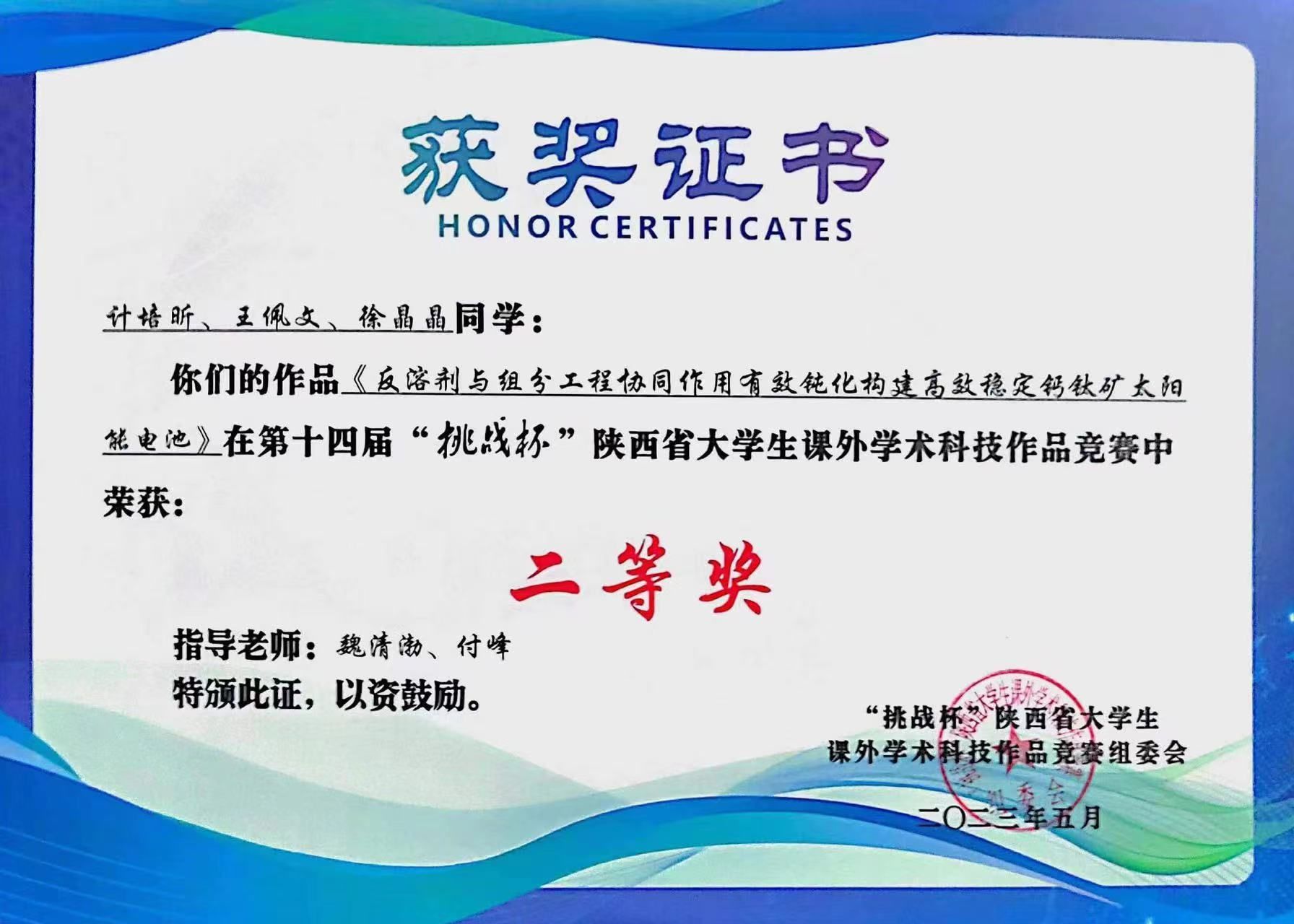 5月20日下午,由团省委、省委教育工委、省科技厅、省科协、省社会科学院、省学联、西咸新区管委会共同主办,长安大学承办的第十四届“挑战杯”陕汽集团陕西省大学生课外学术科技作品竞赛落下帷幕。我院4件作品被校遴选参加省赛,最终荣获二等奖1项、三等奖2项,学院再创“挑战杯”竞赛佳绩。
