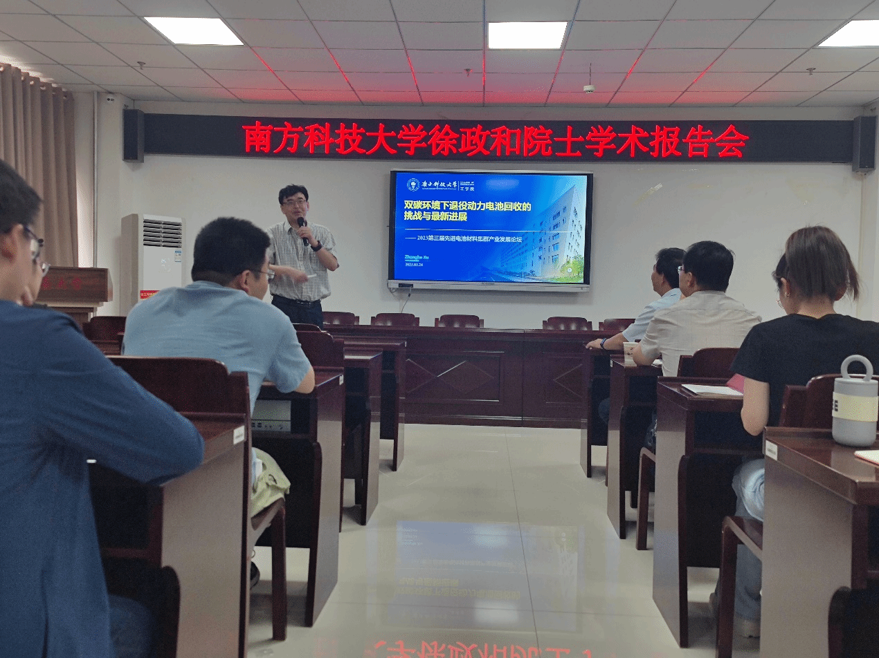 报告会上,徐政和院士做了题为“双碳环境下退役动力电池回收的挑战与最新进展”的报告。徐政和院士首先介绍了南方科技大学工学院,紧接着徐政和院士围绕报告主题,从研究背景、国内外研究现状、所面临的机遇与挑战展开介绍,随后介绍了徐院士团队最新的研究进展,包括可控闪碎技术、传统物料正负极粉末浮选分离、微波低温焙烧强化有价金属回收、钻酸的直接修复、磷酸铁理的直接再生、NCM三元材料的直接再生、石墨再生,最后展望了未来针对废旧理离子电池回收的研究方向和主攻重点。