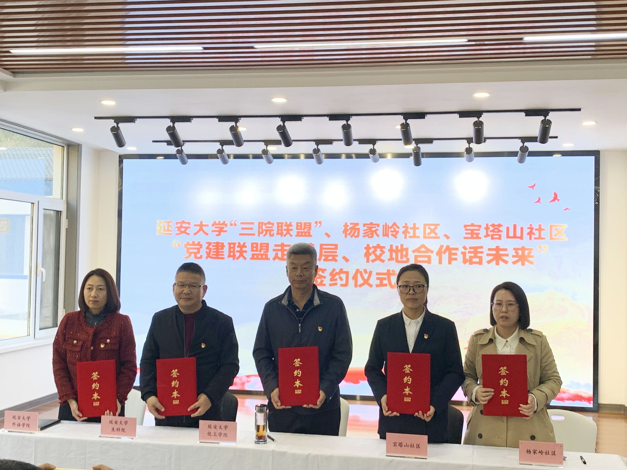 接着, 延安大学“三院联盟”、杨家岭社区、宝塔山社区“党建联盟走基层、校地合作话未来” 签约仪式在宝塔山社区会议室举行。仪式由梁艳主持。各单位党建负责人介绍了本单位特色和亮点党建工作,签订了《“党建联盟走基层 校地合作话未来”合作协议》,一致表示将充分发挥各方资源优势、调动各方积极因素,为搭建实践育人平台、助力基层社会治理、构建特色党建机制贡献力量。