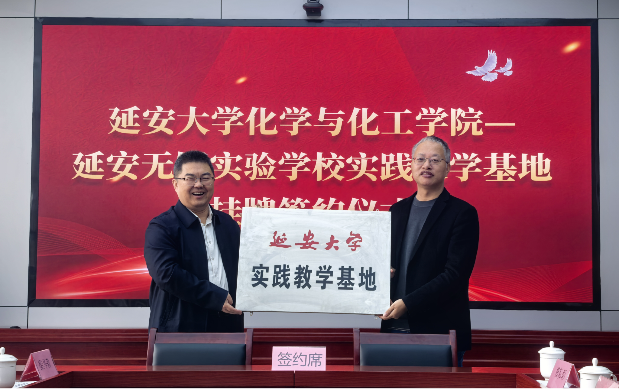 在与会人员的共同见证下,甄延忠为耿雁冰授牌“延安大学实践教学基地”,并共同签署《实践教学基地建设协议书》,标志着双方合作正式启动。签约挂牌后,双方围绕基地运行机制等具体事宜进行了深入交流,并合影留念。