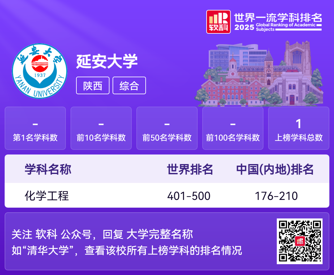 本次软科排名共涵盖57个学科,新增人工智能、机器人科学与工程等前沿方向,评估范围遍及全球92个国家和地区的近2万个学科点。在陕西省16所高校195个上榜学科中,我院化学工程学科表现突出。这一成果得益于学校与学院多年来在学科布局优化、师资队伍建设和产学研协同创新等方面的系统推进,凝聚了全院师生的智慧与汗水。