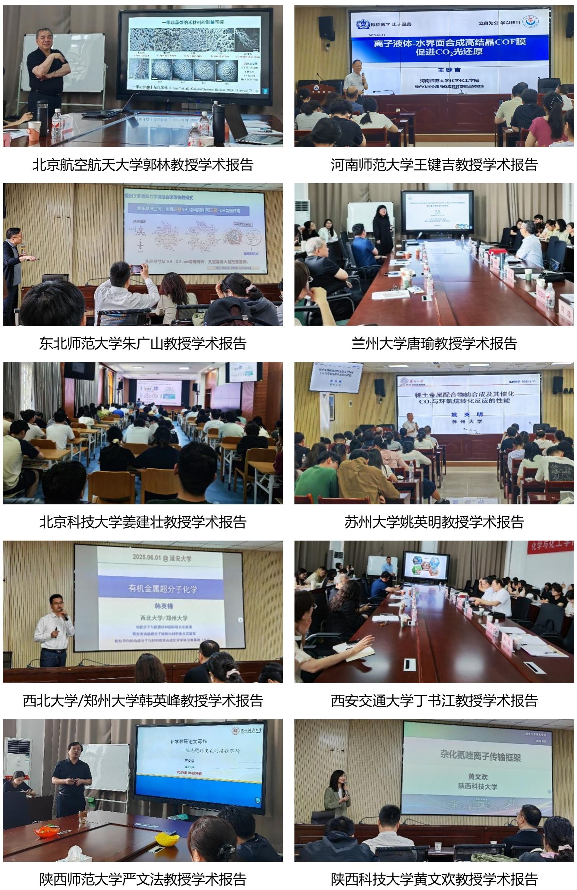 学院积极营造浓厚的学术氛围,大力推进学术交流活动,邀请北京航空航天大学郭林教授、河南师范大学/河南科技大学王键吉教授、东北师范大学朱广山教授、兰州大学唐瑜教授、北京科技大学姜建壮教授、苏州大学姚英明教授、西北大学/郑州大学韩英峰教授、西安交通大学丁书江教授、陕西师范大学严文法教授、陕西科技大学黄文欢教授等10位国内顶尖学者开展学术报告。专家们的报告内容丰富多样,紧扣化学学科前沿热点问题。