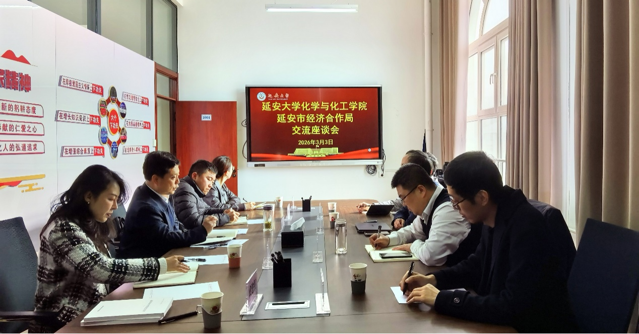 2026年3月3日上午,延安市经济合作局党组书记、局长杨东率队来访延安大学化学与化工学院,就深化校地合作、推动能源化工产业高质量发展开展座谈交流。学院院长甄延忠、徐斌教授等人参加了座谈会。